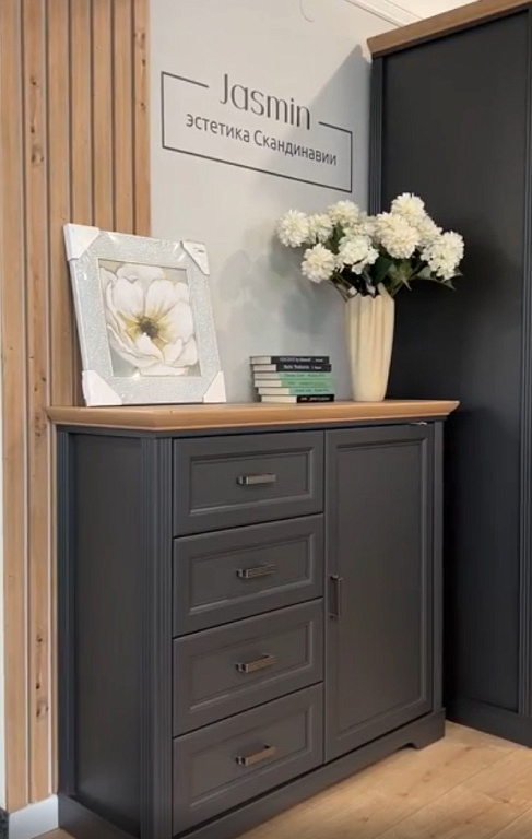 Коллекция Jasmin сочетает классику и скандинавские мотивы: столешницы с древесной текстурой, изящные гофрированные планки и металлические ручки. Графитовые фасады и фурнитура с системой плавного закрывания подчеркивают стиль «тёмный скандинавский».