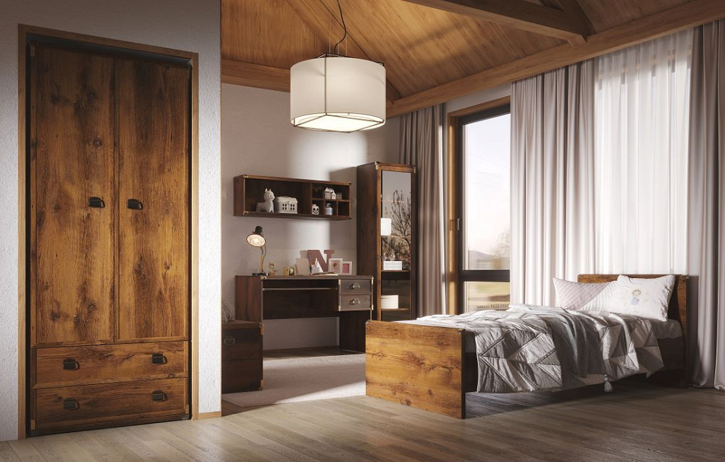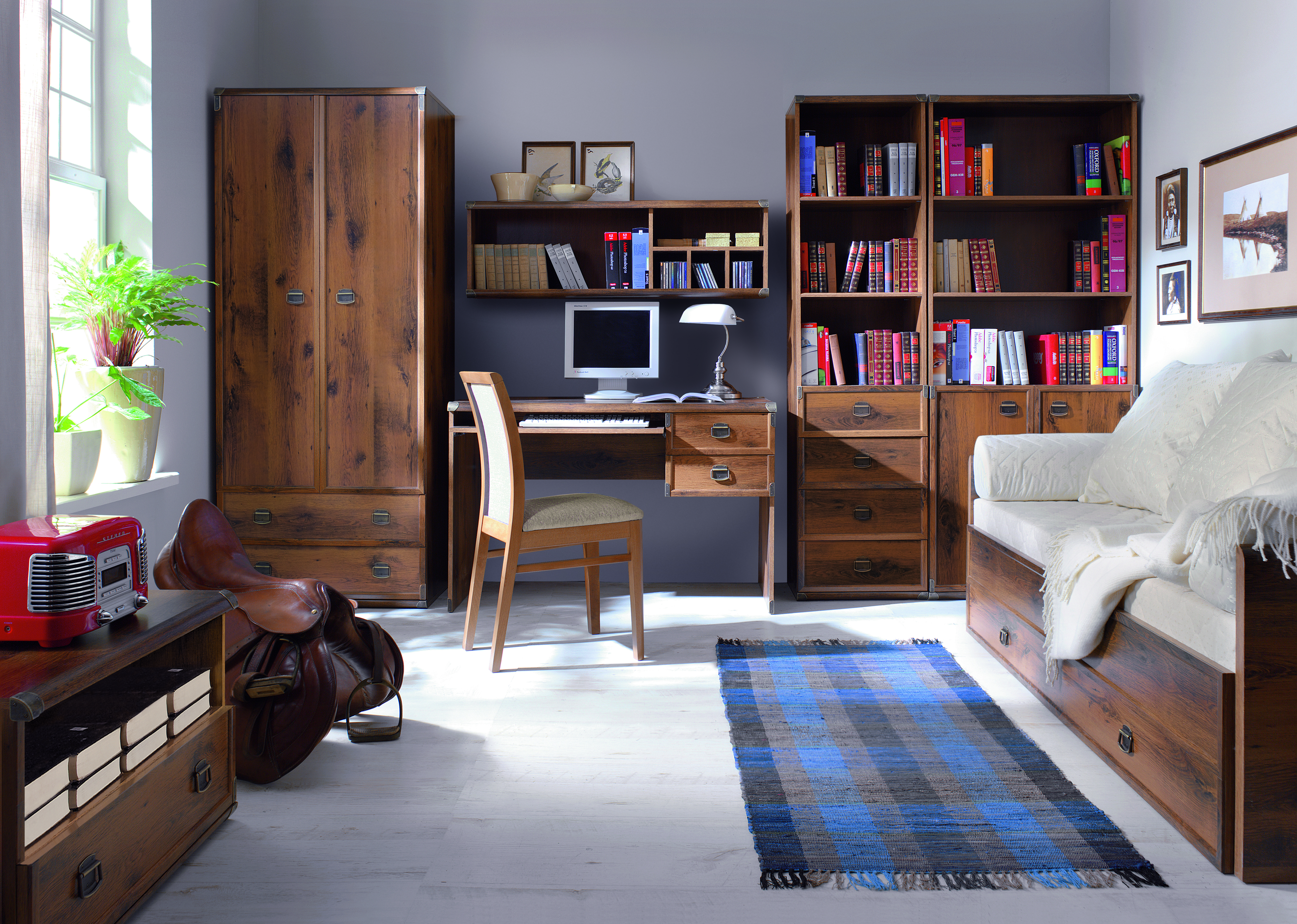 Коллекция Индиана не похожа ни на классическую, ни на современную мебельную моду. Имитация состаренного дерева, металлические накладки на углах, ярко выраженная древесная структура - далеко не все отличительные особенности коллекции. Благодаря широкому ряду элементов системы вы без труда обустроите молодежную.