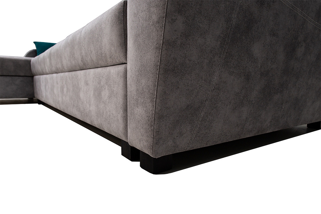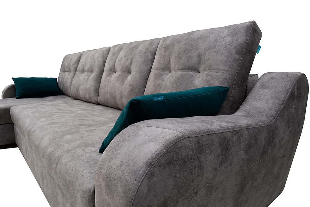 Комплект углового дивана включает в себя длинную секцию 1 Д и угловой модуль с подъемным механизмом 2П с ящиком для хранения постельного белья. Также в комплект входят 2 декоративные подушки. Угловая секция взаимозаменяемая — есть возможность монтажа как справа, так и слева от всей конструкции.