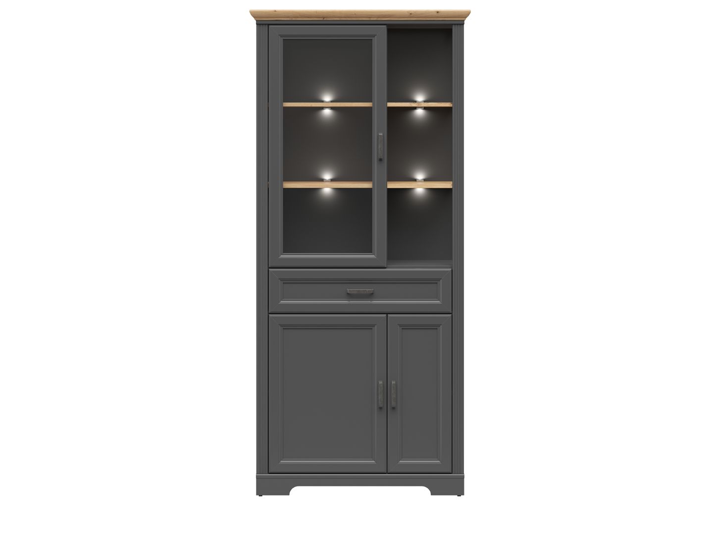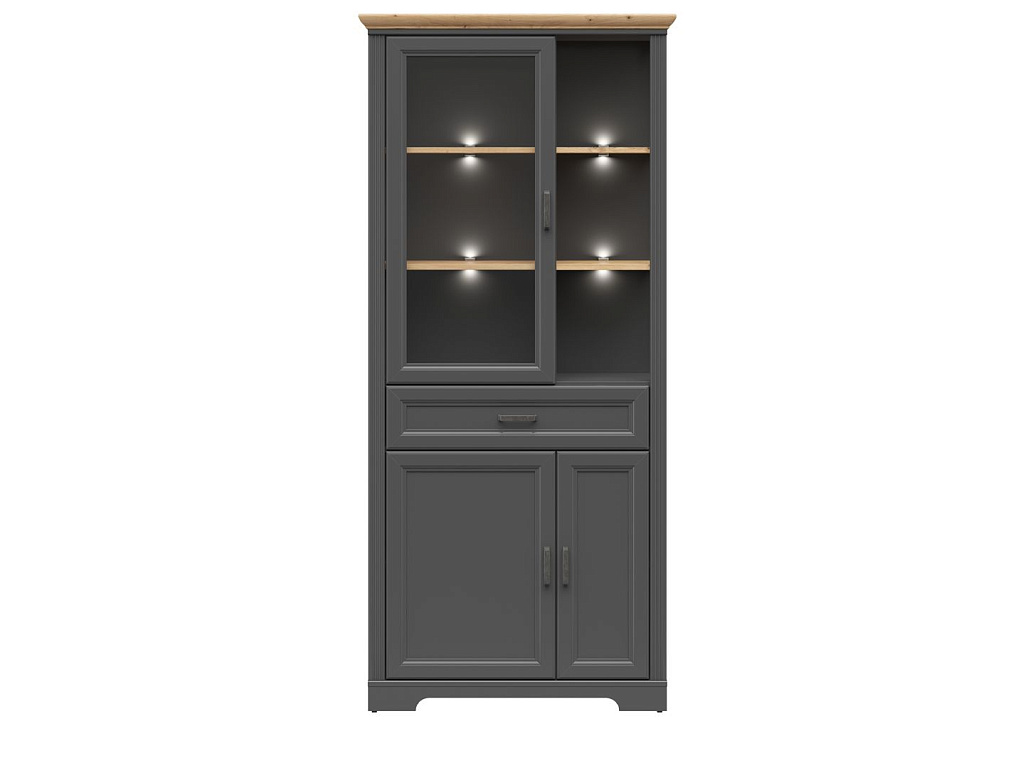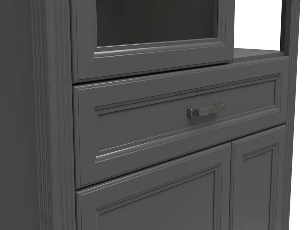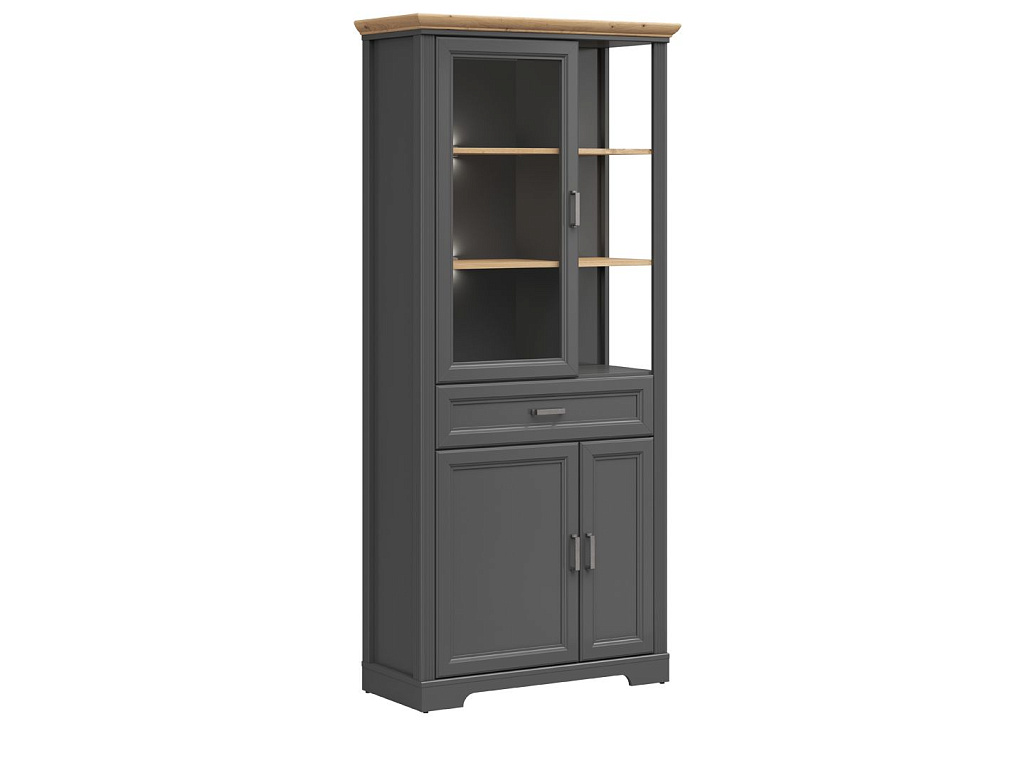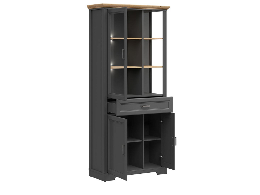 - в верхней части шкафа расположены: открытое отделение с полками, отделение за распашной дверью со стеклянной вставкой