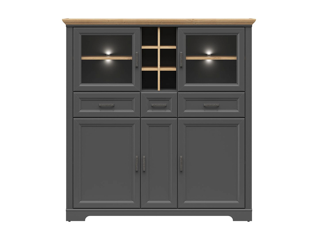- в верхней части шкафа расположены: 2 отделения для хранения за стеклянными дверями, открытое отделение с ячейками