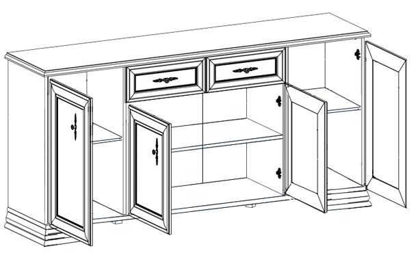 • Тумба разделена на 4 отделения: отделения с полкой за распашными глухими дверями, 2 выдвижных ящика на металлических роликовых направляющих, отделение с полкой за 2-мя распашными дверями.