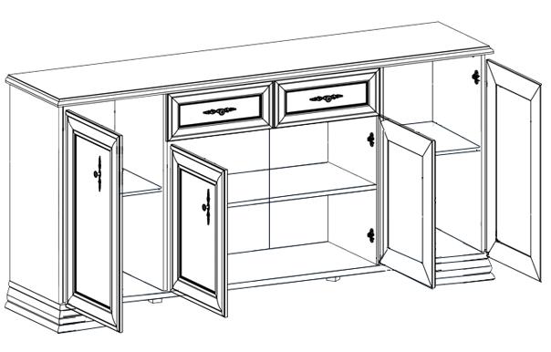 - Тумба разделена на 4 отделения: отделения с полкой за распашными глухими дверями, 2 выдвижных ящика на металлических роликовых направляющих, отделение с полкой за 2-мя распашными дверями.