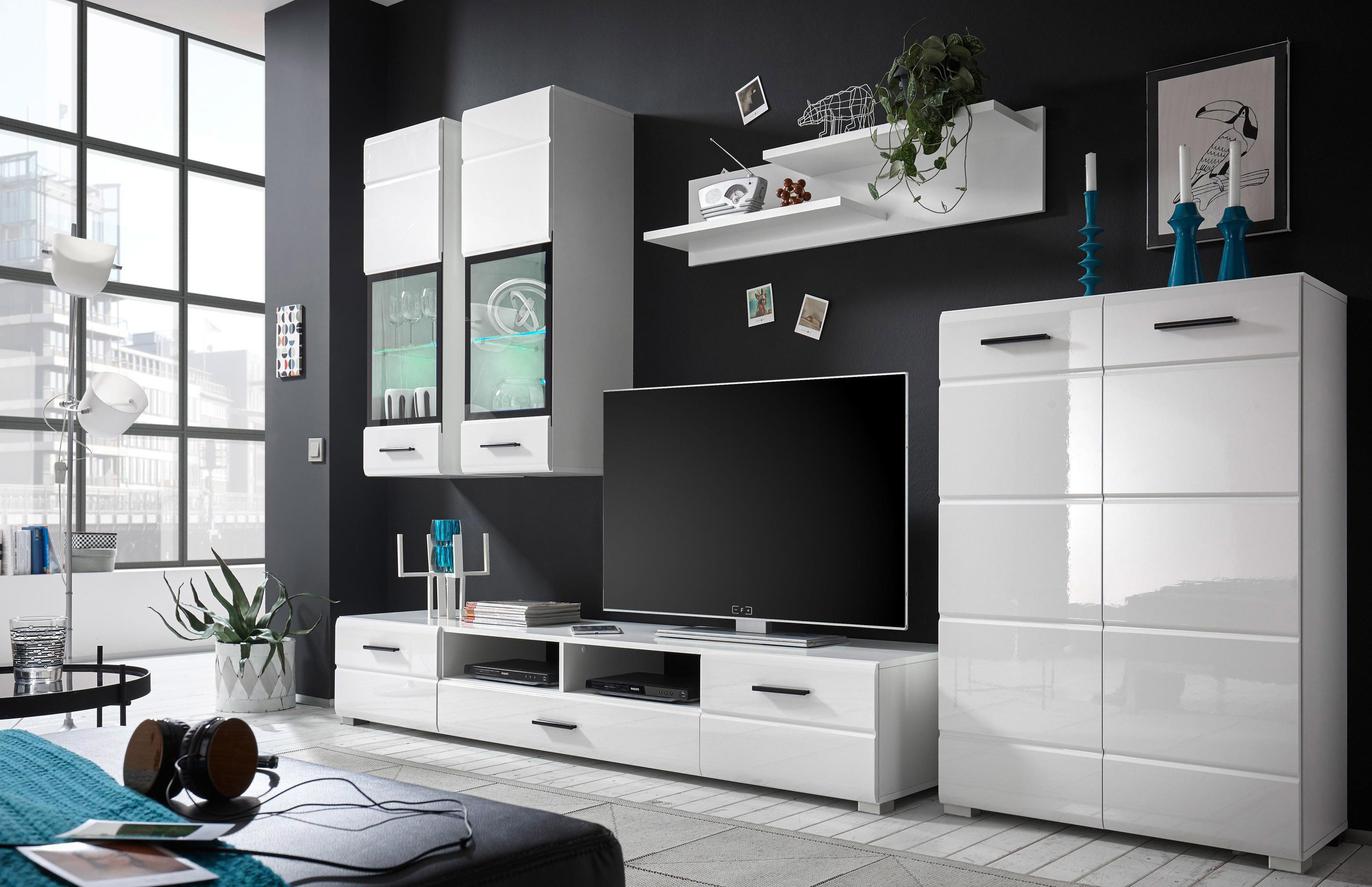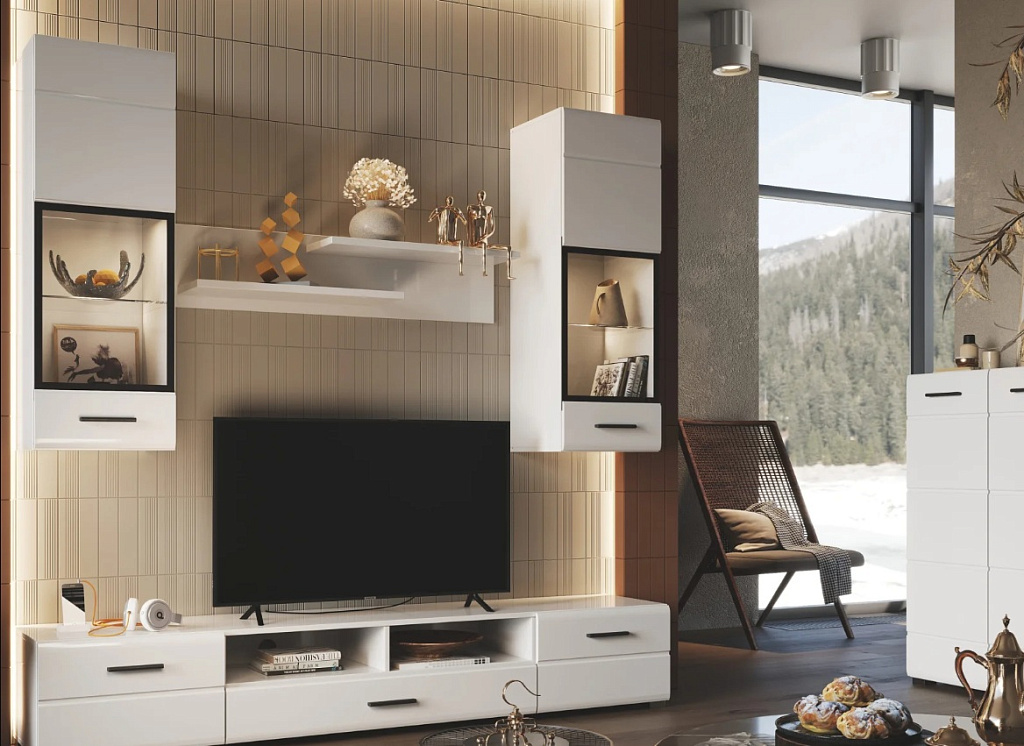 Комплект характеризуется белыми глянцевыми фрезерованными поверхностями фасадов и плоскими ручками чёрного цвета.