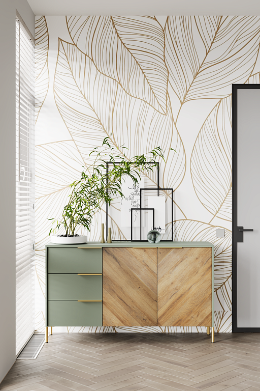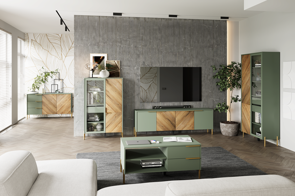 Изящное сочетание цветов натурального дерева и мягкого приглушенного зеленого колера сделают интерьер вашей гостиной индивидуальным и стильным. Легкость и современность коллекции придают металлические тонкие ручки и ножки в золотом цвете, невесомая LED-подсветка.