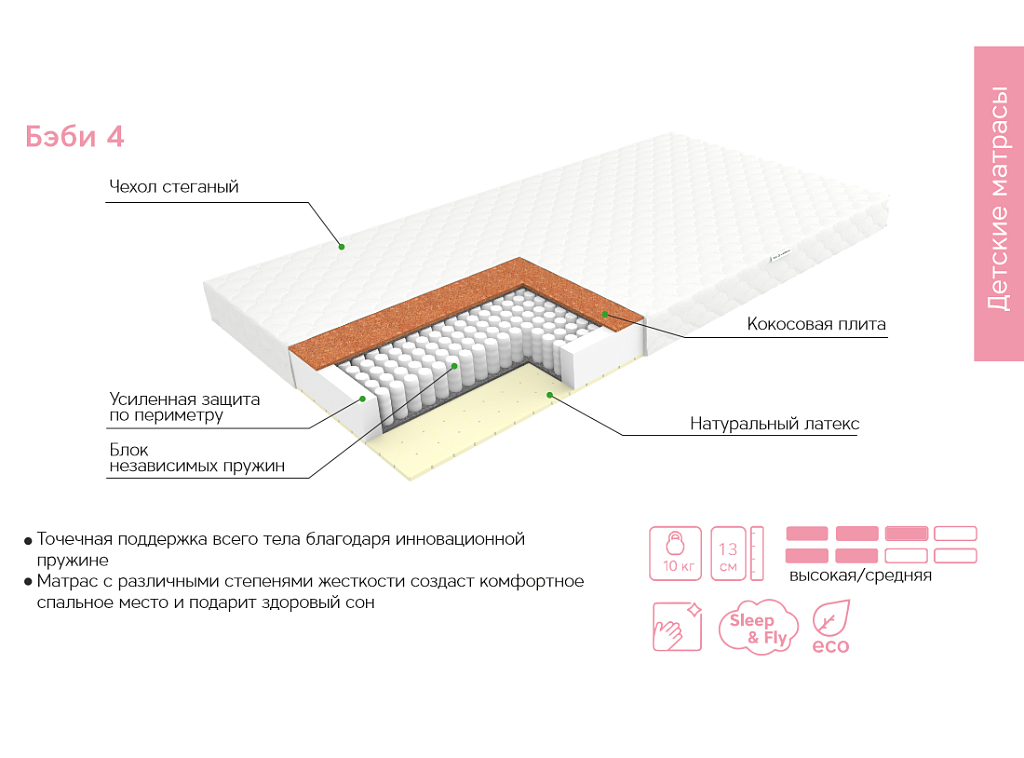 Натуральный гипоаллергенный материал. Благодаря пропитке из натурального латекса, волокна прочно скреплены в цельную плиту. Кокосовое волокно придает матрасу жёсткость и обладает бактерицидными свойствами. Производство – Enkev, Польша.