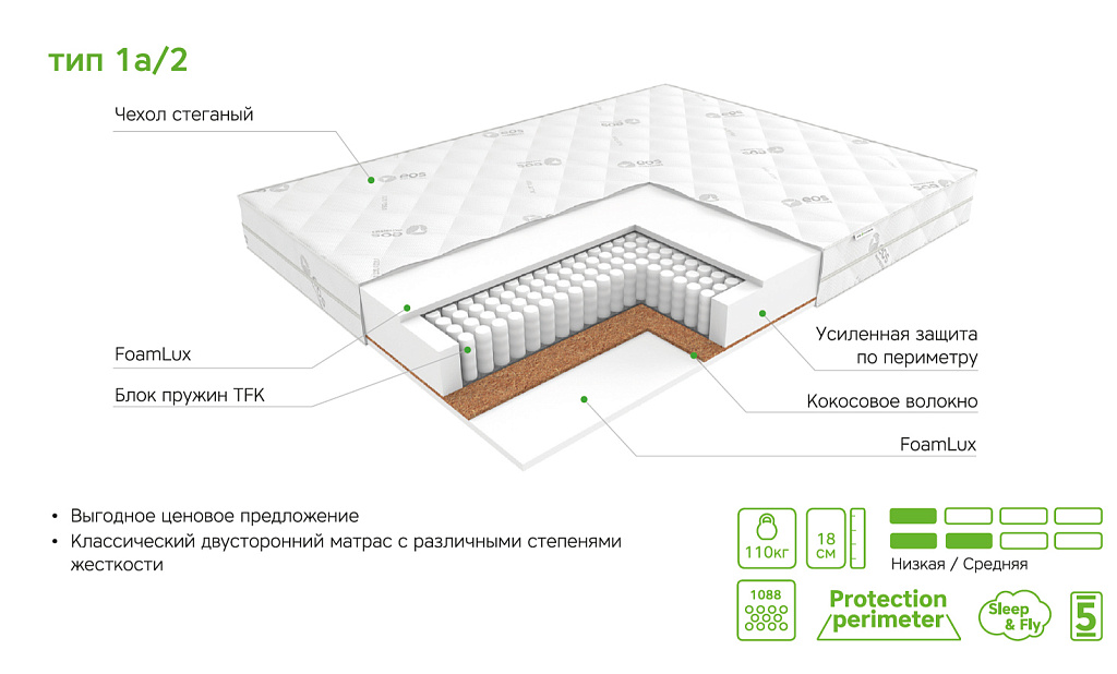 Натуральный гипоаллергенный материал. Благодаря пропитке из натурального латекса, волокна прочно скреплены в цельную плиту. Кокосовое волокно придает матрасу жёсткость и обладает бактерицидными свойствами. Производство – Enkev, Польша.