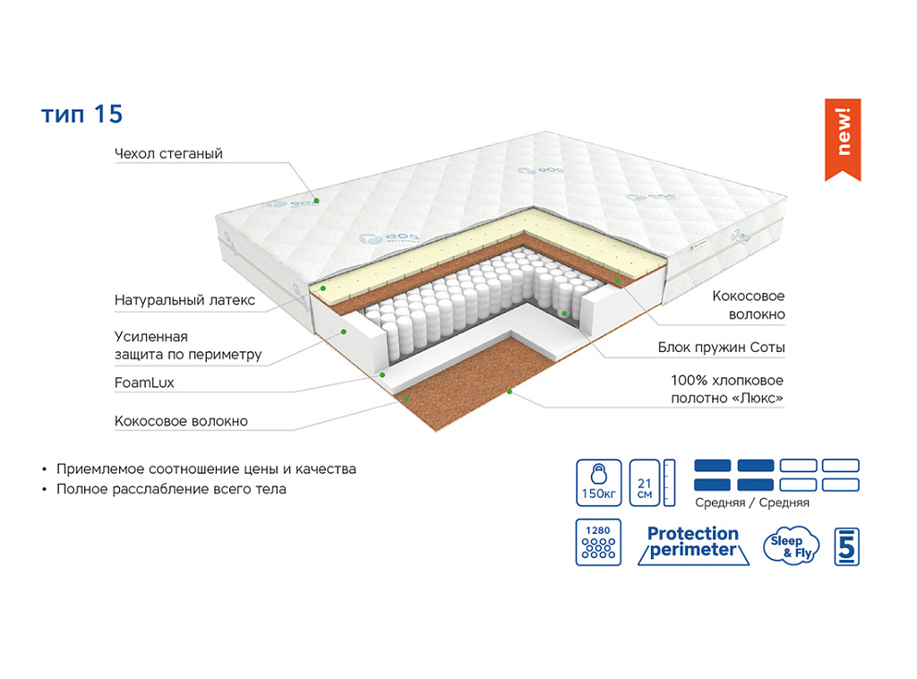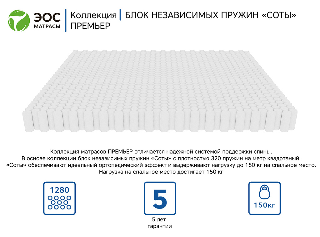 В пружинном блоке, усовершенствованное расположение пружин в виде пчелиных сот, позволяет увеличить плотность пружин до 320 пр/м2. Благодаря этому матрасы обладают исключительной устойчивостью к повышенным нагрузкам на протяжении длительного времени.