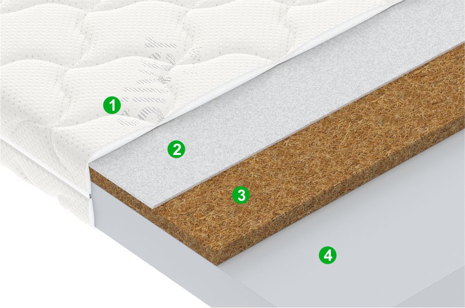 | Кокосовая койра | Натуральный материал из кокосовых волокон, спресованных в однородные плиты. Слой используется для придания матрасу дополнительной жесткости. |