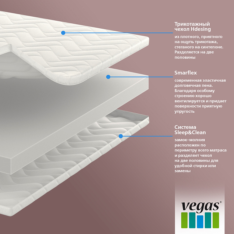 Невысокая беспружинная модель на основе эластичного пенного материала Smartflex, придающего матрасу вентилируемость и комфортную упругость.