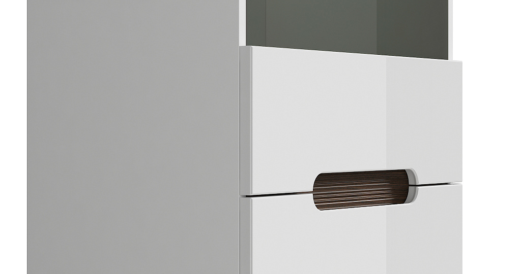 Коллекция выполнена с стиле минимализма. Современный дизайн, футуристические элементы, оригинальный способ открывания, белые глянцевые фасады, контрастирующие с декоративными рифлеными вставками цвета Дуб венге