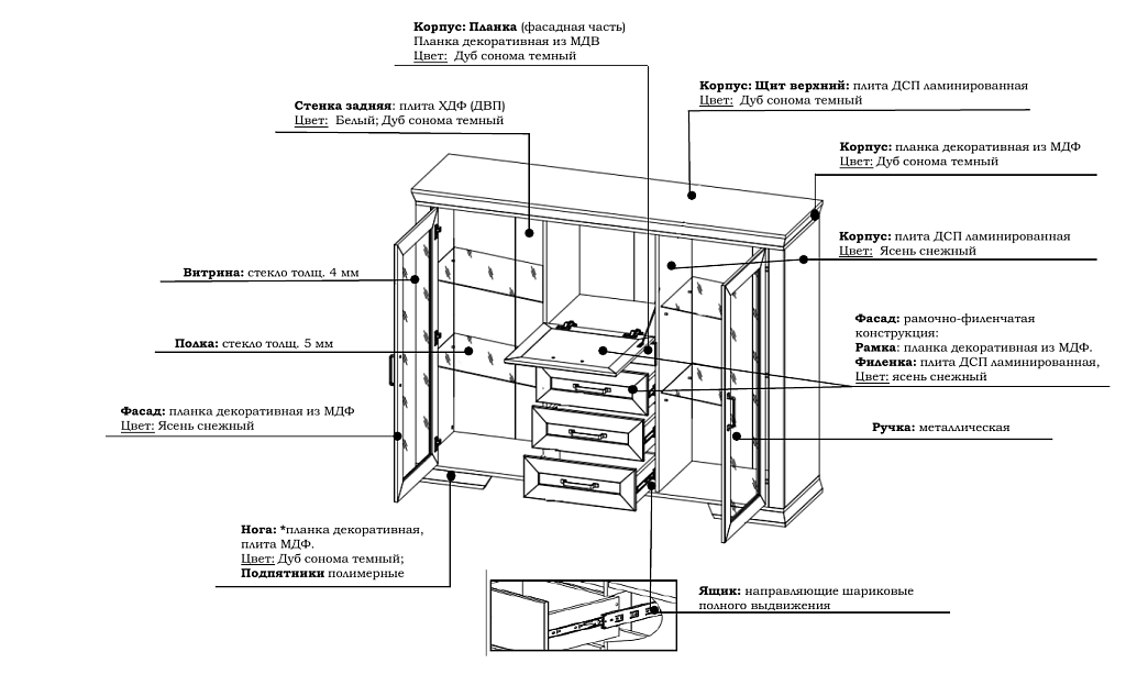 | Фурнитура | Hettich (Германия), Boyard (Россия), FGV (Италия), Schwinn (Германия) |