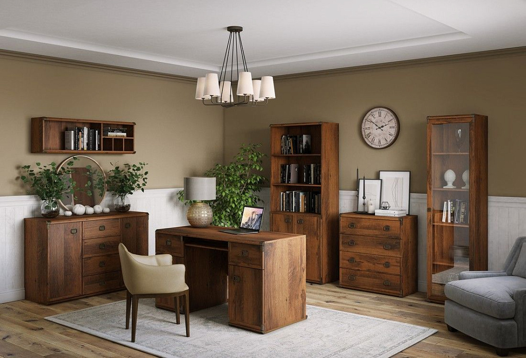 Коллекция мебели ИНДИАНА – набор в стиле дикого запада. Интересный дизайн набора, имитирующий состарившееся отполированное дерево, с оригинальной формой ручек, неповторимый характер. Функциональный и законченный вид элементов создают металлические края верхних и нижних углов мебели.